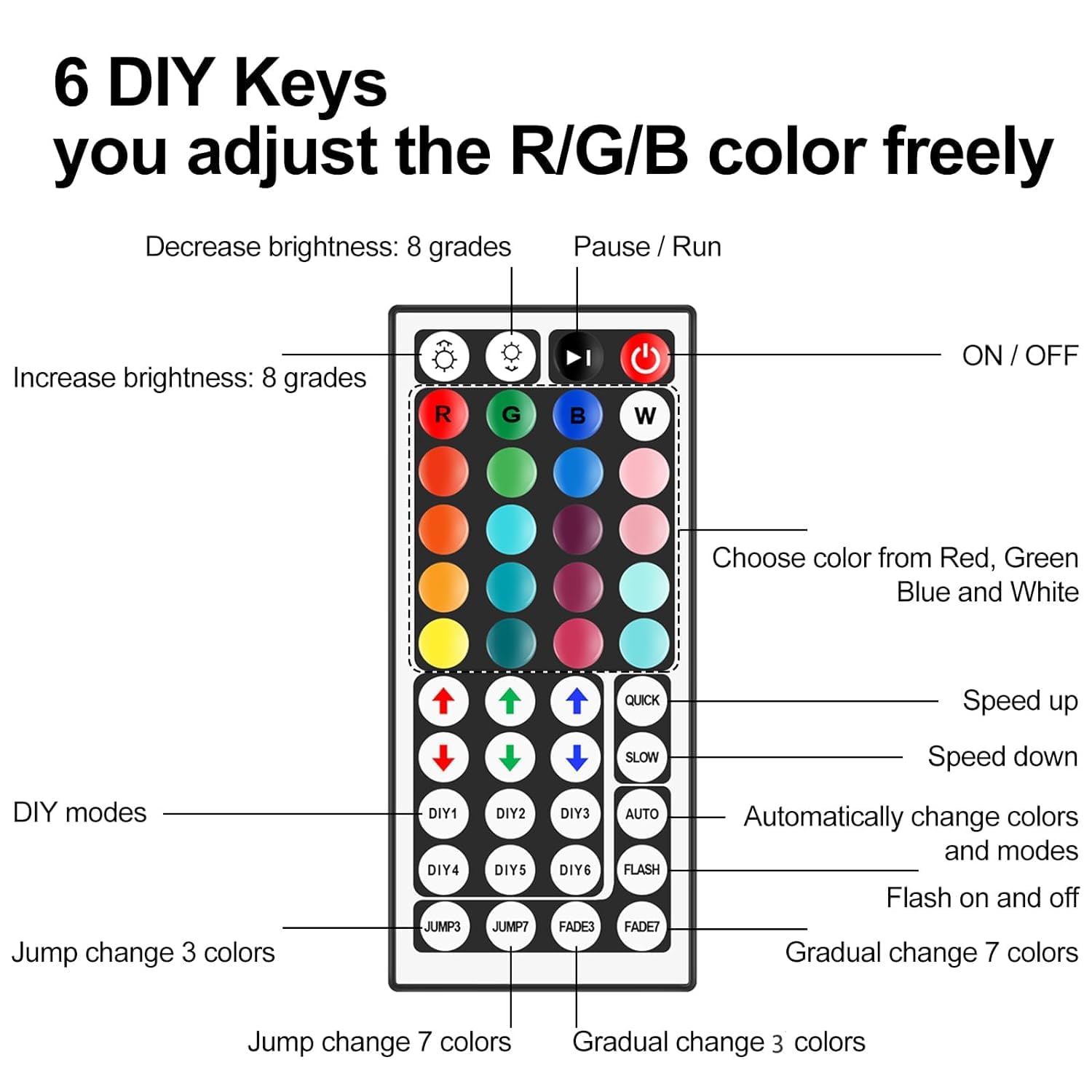 - 【Intuitive DIY Mode on Remote】Personalize your lighting effects and the colors display with our easy-to-use DIY mode. 6 levels of brightness grant you further control the RGB lights when creating the ideal lighting atmosphere for your favorite indoor activities.